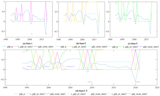 Figure 1. States 1 to 3: filter transition probabilities and GDP. Note: g d p _ p is the gross domestic product, s _ g d p _ p _ p r _ s t a t e 1 reflect state one filter transition probabilities, s _ g d p _ p _ p r _ s t a t e 2   s t a t e 1 reflect state two filter transition probabilities, s _ g d p _ p _ p r _ s t a t e 3   s t a t e 1 reflect state three filter transition probabilities, g d p _ m e a n _ s t a t e 1 is the mean of gross domestic product in state one, g d p _ m e a n _ s t a t e 2 is the mean of gross domestic product in state two, and g d p _ m e a n _ s t a t e 3 is the mean of gross domestic product in state three.