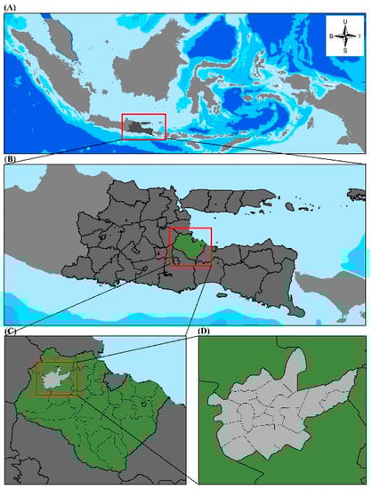 Map of study area: (A) East Java in Indonesia. (B) Pasuruan Regency to East Java. (C) Map of Pasuruan Regency; the highlighted area shows Pandaan District. (D) Pandaan District.