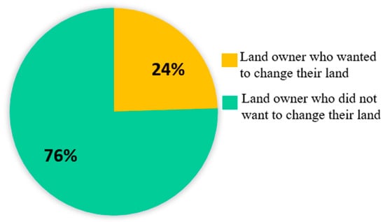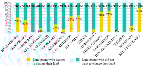 Figure 2 illustrates that from the total number of SFAL landowners in Pandaan District, 76% answered that they did not intend to change the land, while 24% said they intended to change the land (Figure 2). These results are linked to social capital in Pandaan District. The distribution of the percentage of respondents in land change decisions in each village in Pandaan District is shown in Figure 3.