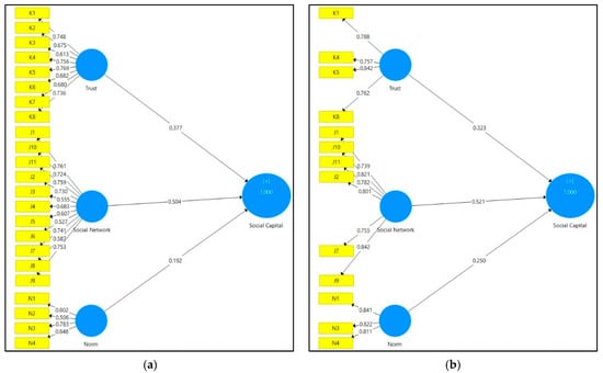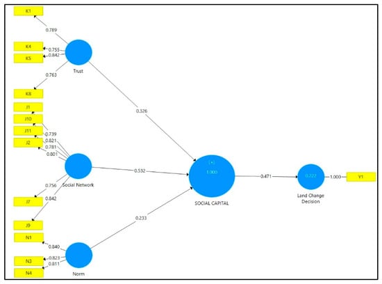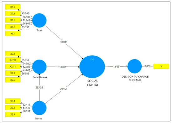 Figure 3 illustrates that 100% of landowners in Wedoro Village, Sebani Village, Karangjati Village, and Durensewu Village have no intention to change their land, while in Banjarkejen Village, Kutorejo Village, Plintahan Village, Sumbergedang Village, Tawangrejo Village, and Pertungasri Village, more than 50% of respondents answered that they wanted to change their land (Figure 3). After knowing the land change decisions in Pandaan District, the next step was to find their relationship to social capital using structural equation modeling (SEM) analysis applied in PLS-SEM software.