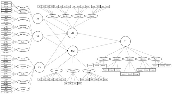 In this research, there are three variable concepts, including the Regulatory Environment, the impact on professionalism will be used the stimulus-organism-response (SOR) model of Mehrabian and Russell (1974). Regulatory Environment (X1), Competition Environment (X2), Cultural Environment (X3), Organizational Culture (M1), Organizational Structure (M2), and Implementation of Corporate Governance (Y1). Scaling indicators—variable response indicators using interval scales with scores 1–7, which means that the value one will be worse and the value seven will be better for assessing the variables’ attributes (Nachmias and Nachmias 1987). Data will be said as good and quality if using quality measurement instruments. A quality instrument is an instrument that has a reliability of a measure and validity or validity of a measure. The variable reliability test method used the Pearson Product Moment Correlation Reliability method and Cronbach’s Alpha. Pearson Product Moment Correlation, to measure the strength of the relationship between variable X and variable Y, and be used to determine the validity of an instrument for several interval data. Validity test of the measure to find out how well the indicators represent the variables following the operational definition of the variable: the better the suitability, and the higher the validity of the measurement (Newman et al. 2013). Validity test of the criteria level carried out in research by testing and calculating the Pearson Correlation coefficient between each indicator with a total score of all indicators.