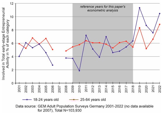 Figure 3 also shows that the 18–24 age group is relatively heterogeneous in terms of TEA rates. It ranges from 3.8% for 18-year-olds to just under 6.5% for 24-year-olds and increases with age (but not for each cohort), although not steadily. Within this context, a note on the statistical representativeness of the GEM data was used. In our sample, 18–24-year-olds account for 10.8% of all 18–64-year-olds interviewed (or 5060 of the 46,937 persons interviewed). For the individual cohorts of 18–24-year-olds, there are between 662 cases (for the 20-year-olds, 1.4% of the total sample) and 766 cases (for the 24-year-olds, 1.9% of the total sample). These percentages are sufficiently close to the corresponding figures for Germany as a whole. According to the German Statistical Office (), in the year 2018, a total of 10.4% of 18–64-year-olds were between 18 and 24 years old. This value deviates only slightly from the above-mentioned reference value of our sample (10.8%). Even for the seven individual cohorts of 18–24-year-olds, the differences between the sample and population are never higher than 0.12 percentage points.
