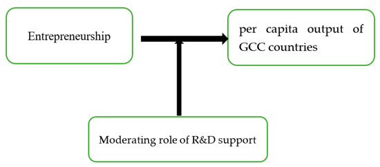 The literature on the relationship between entrepreneurship and per capita output has shown mixed results, with some studies indicating a positive relationship and others suggesting no significant relationship. Additionally, the role of research and development (R&D) support as a moderator in this relationship has not been extensively studied, particularly in the context of the Gulf Cooperation Council (GCC) countries. Therefore, this study aims to fill this gap through examining the moderating role of R&D support in the relationship between entrepreneurship and per capita output in the GCC countries. The originality of this study lies in its focus on the GCC countries, which are characterized by unique cultural, economic, and institutional factors that may influence the relationship between entrepreneurship and per capita output. Furthermore, this study examines the moderating role of R&D support, which has received limited attention in previous studies on this topic.