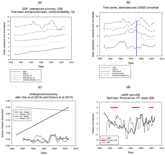 Time series. (a) Raw time series normalized to unit standard deviation and each series shifted vertically in steps of three units. (b) Series detrended and normalized. Drop-line(the blue line) shows the date 1997:4 when major tax shocks occurred in both personal and corporate taxes. (c) Comparison of two time series for UGE after Orsi et al. (2014) and tax evasion after Chiarini et al. (2013). The series are linearly detrended (trends: upper two straight lines). The residuals (lower two curves) are centered and normalized. (d) GDP first difference ΔGDP = GDPt+4 − GDPt and UGE linearly detrended. Red horizontal lines show periods where PT leads UGE. GDP = gross domestic product, UGE = underground economy, TT = total taxes, PT = personal taxes.