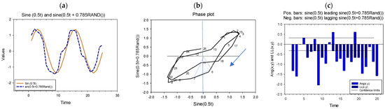 The two sine functions are shown in a dual representation, as time series along a time axis, Figure 2a, and in a phase plot with one series depicted on the x-axis and the other series depicted on the y-axis. In this example, the trajectories for the x(t), y(t) pairs will rotate in a clockwise direction, as in Figure 2b. Pairs of ideal cyclic time series that are centered and normalized to unit standard deviation will show an elliptic form with center in the origin. With the major axis along the x = y-axis and with a phase shift of less than ¼ of a cycle period, the two series are pro-cyclic. With the major axis along the x = −y-axis and with phase shift in the range ¼λ to ½λ, the two series are counter-cyclic. If the trajectory rotates positively (counterclockwise per definition) then the x-axis variable leads the y-axis variable.