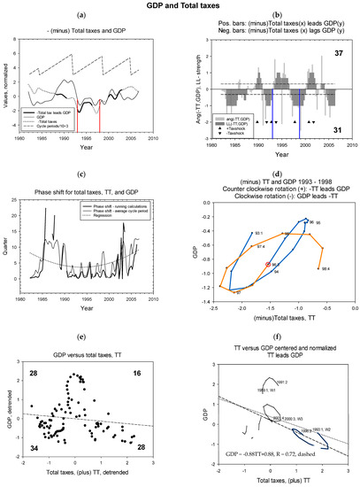 Since the effects of tax changes take time, the time series for GDP were shifted backwards in time relative to -TT. Shifting the series relative to each other caused the β-coefficient to decrease from −0.88 to −1.04, and the explained variance to increase. However, using one overall shift for the whole series is only an approximation, since the lead time between -TT and GDP change in size and in direction. The lead time using cross-correlation techniques resulted in a lead time of three quarters. This is a little less than the average lead time for the whole series. One would assume that the effect of reducing taxes depends upon the tax level at the time of tax changes. Our result suggests that the effect of reducing taxes has been most effective at tax levels above 32% in Italy during the period 1982 to 2006 (see Figure 3f). At lower tax levels, taxes and GDP start cycling with cycle periods of about 2–3 years (8–12 quarters), probably because low tax levels are not sustainable either economically or politically.
