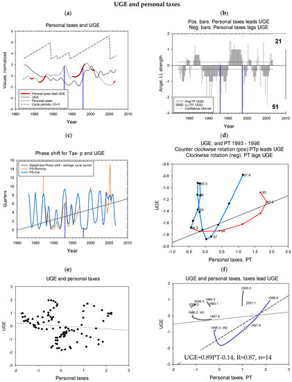 Shifting UGE backwards relative to PT. If we shift UGE 2 quarters backwards (the full data set in Figure 4e), corresponding to the lag in the effect on tax reductions on UGE, the explained variance increases from R2 = 0.09 to R2 = 0.18 (statistics not shown in the table), the β-coefficient increases from 0.27 to 0.38, and the p-values decrease from 0.029 to 0.004. With time series 5–14 quarters long, taxes change, and UGE responds to the changes. For the pairs PT and UGE, the pairs undergo cycles from 1/3 cycle to one full cycle. Only the shock in PT in 1997:4 (+3.8) affects PT and UGE in a time window where PT → UGE. Table 2 also shows that the average response for the four first quarters is positive, although not significantly (n = 4).