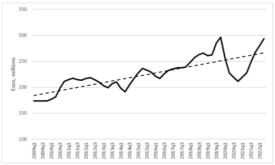 Before we proceed with the estimation, it is useful to illustrate the path of the main variable of interest. Figure 1 shows the path of ship management revenues in the country. As the path shows, revenues have been increasing over time, evidenced by the dashed trend line. Excluding the pandemic period, revenues have almost doubled since 2009, while they have fully recovered to their pre-Covid levels by 2022q2. To illustrate how important these revenues are for the country, we note that they have averaged around 4.6% of Cyprus’ GDP.