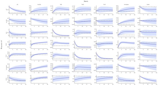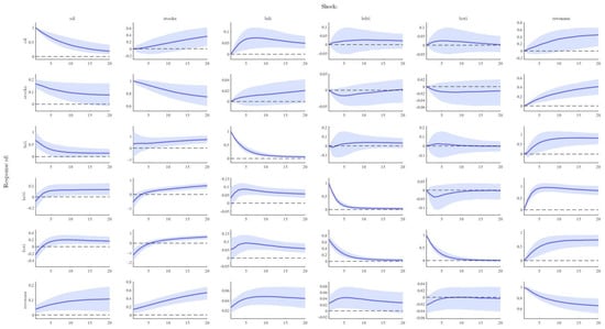 Impulse response functions. The solid blue line refers to the impulse response of the relevant variable to a shock, while the shaded area is the 68% confidence interval. For example, the first chart in the second line refers to the response of the stock market following a shock in oil prices.