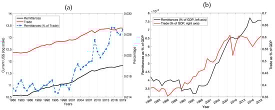 Aggregate flows of international remittances. (a): Aggregate world remittance and trade flows (current USD). (b): Remittances and trade as a percentage of world GDP. Source: Authors’ calculation based on World Bank WDI data.