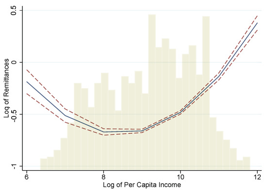 We also detect a consistent and robust non-linear impact of income (pcGDP) at destination. More precisely, as Table 1 shows, we find that the relation between home income and remittances is U-shaped, with remittance flows decreasing for low-income levels and increasing for high-income ones. The U-shaped relationship between (per capita) income and remittances observed in the whole data sample, is depicted in Figure 2. There, we plot the marginal effect of pcGDP (across its observed range) on bilateral remittance flows on a log–log scale (for the specification in Table 1, column 2) and we add in the background a histogram of the observed whole-sample distribution of pcGDP at destination.