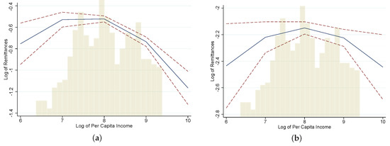 Third, and more importantly, we still find a strong and non-linear effect of per capita GDP on remittances in income group regressions. However, while whole-sample exercises suggested a U-shaped relationship, with remittances first decreasing and then increasing with income at destination, estimates in Table 2, columns (1)–(2), show that an inverse U-shaped relationship is now in place (cf., Section 5.3 for further evidence). Therefore, contrary to what happens when one takes into account all global remittance flows, when we discriminate between origin and destination income groups, investment or exchange motives seem to be behind remittances from rich and middle countries to poor ones when home per capita GDP is low. Instead, when the income of a poor destination country grows, altruistic motives seem to dominate remittance behaviors of migrants sending money from richer countries; see Figure 3. This is in line with studies focusing on private transfers in less-developed countries (Cox et al. 1998).