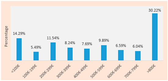 Besides the length of stay, it is important to investigate the variables that describe the intention to spend and most importantly the size of the tourist expenditure for 2023. Thirty percent of respondents answered they would spend EUR 800, which was 31% higher than what was stated in 2021 and 4% higher than what was stated in 2022. Moreover, 14% answered they would spend less than EUR 100, 12% stated they would spend in the range EUR 200–299, 10% would spend in the range of EUR 500–599, 8% would spend EUR 300–399, 8% would spend EUR 400–499, 7% would spend EUR 600–699, 6% would spend EUR 700–799 and 5% would spend EUR 100–199. These answers did not change significantly across the three studied years (2021, 2022 and 2023). The expenditure frequency is shown in Figure 4.