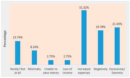 In open-ended questions with respect to the financial impact inflicted on respondents, 20% answered that they experienced no impact from the higher energy prices, whereas 80% stated they experienced various negative consequences. A total of 3% stated that they became unable to save money, 3% stated they had experienced a loss of income, 31% stated that their expenses had increased, 20% stated that they were negatively impacted and 21% identified themselves as having to cope with a severe financial impact (Figure 6).