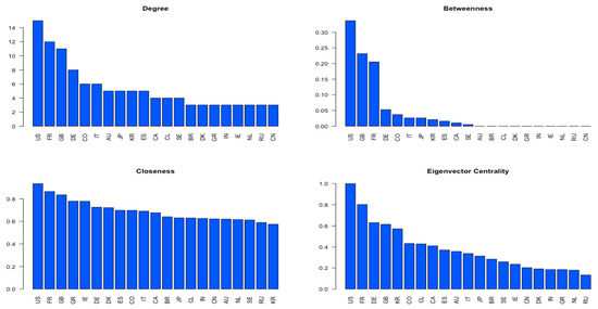 where refers to the number of shortest paths connecting node and , and is the number of shortest paths from to passing though node v (Freeman 1977). The results from betweenness centrality indicate that the USA has the highest betweenness score, followed by the United Kingdom and France.