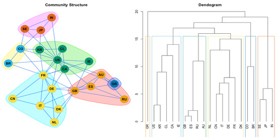 Figure 4 shows the discovered community structures of economic policy uncertainty across 21 developed and emerging economies. The colors correspond to the best partition found by optimizing the modularity of Newman (2002, 2003, 2004). Communities are also represented by the dendrogram, or hierarchical tree. Cutting the dendrogram horizontally corresponds to dividing the network into communities. The results of the community structure detection reveal that there are six communities. Based on the result, it appears that the communities recognize geographical ties between indices, with indices located in the same region connected to each other. While it appears that the communities recognize geographical ties between indices, some countries cluster with other countries located in different regions: Greece has her own cluster; Chile, South Korea, Republic of Ireland cluster with countries in North America; China is part of the European cluster and is tightly composed by European countries; Sweden is part of Asian cluster; the most interesting cluster is composed of Russia, the United Kingdom, Spain, Australia.