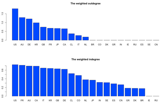 In Figure 7, the weighted indegree and outdegree of each country in the PCPG are displayed. The dominance of the USA, indicated by its highest weighted outdegree, clearly highlights its pivotal role in the system, implying its significant control or influence over other countries.