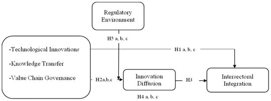 This study’s theoretical framework is represented in Figure 1, which illustrates the interplay between technological innovations, knowledge transfer, value chain governance, innovation diffusion, and intersectoral integration. Drawing on the diffusion of innovations theory and existing literature, the framework visually represents the relationships and dependencies among these key variables, highlighting the moderating role of the regulatory environment in shaping the association between innovation diffusion and intersectoral integration.