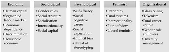 Female labour force participation, therefore, is a complex and multifactorial problem, which must be approached from different disciplines, giving rise to theories that examine its determinants and explain the phenomenon. These theories provide an economic, sociological, psychological, feminist, organisational and demographic perspective on the problem, which are not mutually exclusive, but rather complement each other to strengthen understanding and overcome their individual limitations (Figure 1).