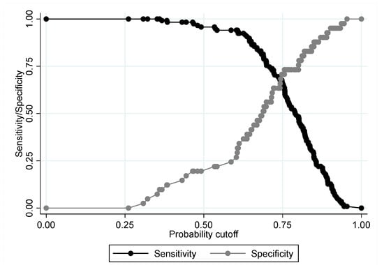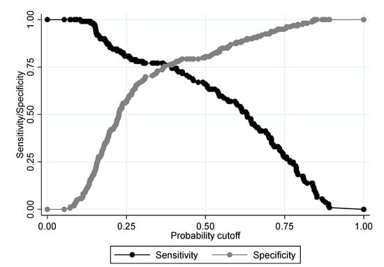 Sensitivity and specificity of the logit model for the probability cut-off point.