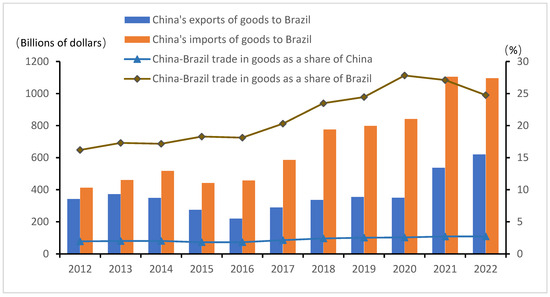China-Brazil trade in goods and share of total trade in goods between China and Brazil, 2011–2022.