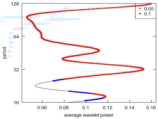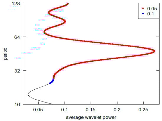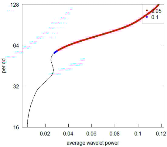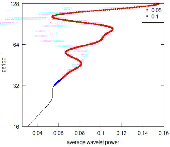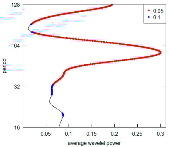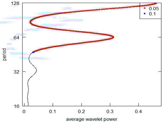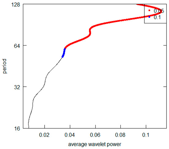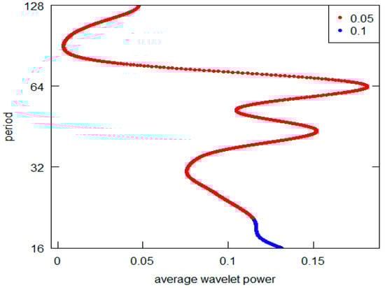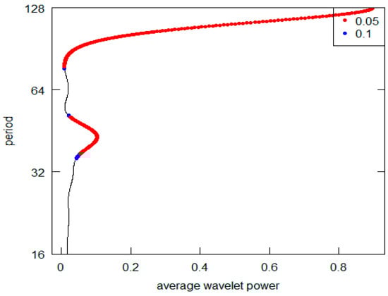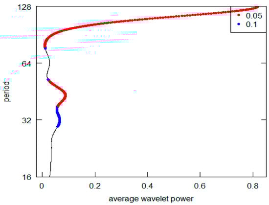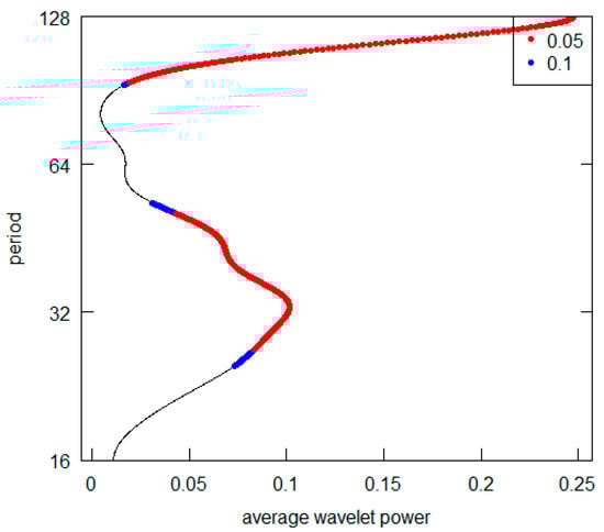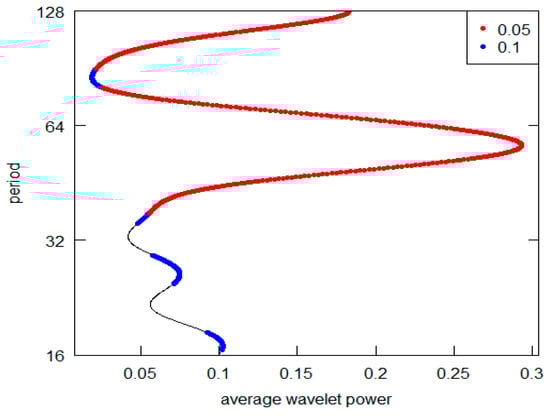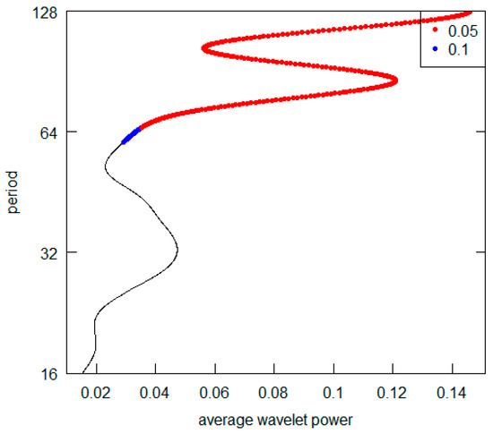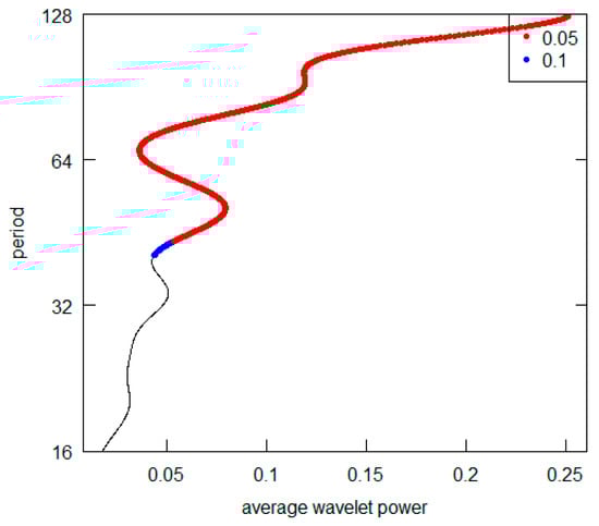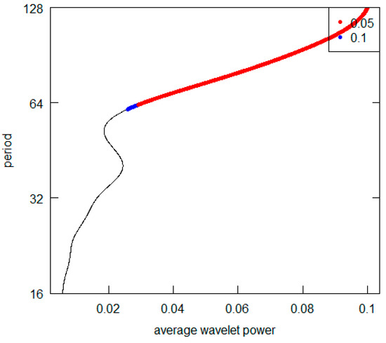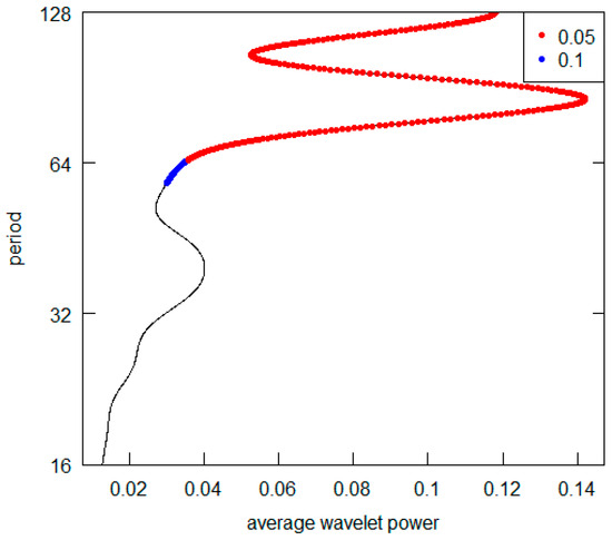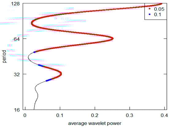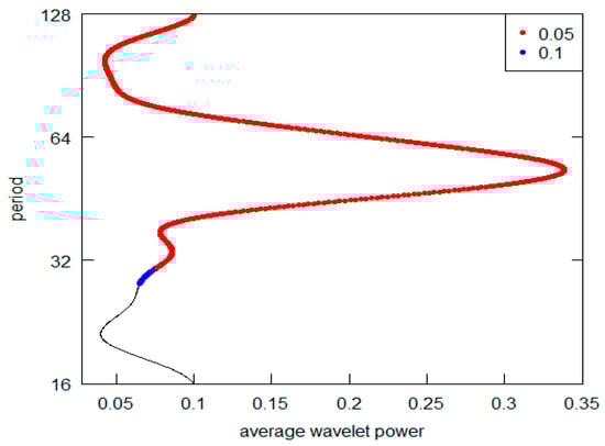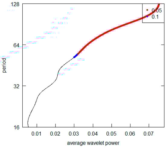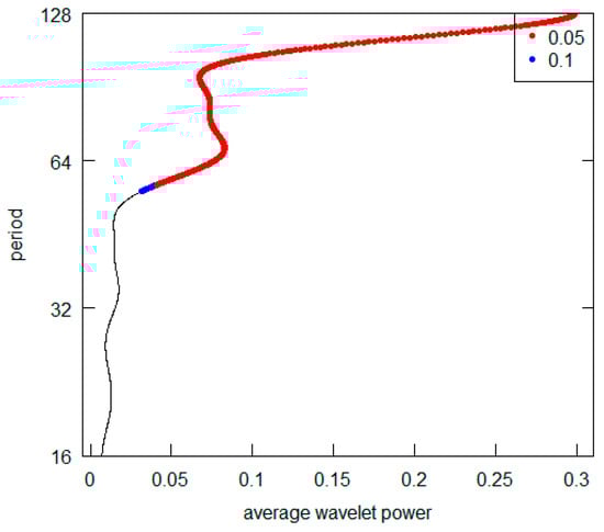 Thus, our first statistical step is to compute the WT of the univariate time series with a constant (annual) period by using the Morlet. Secondly, to show relevant periodicities, we plot the Average Wavelet Power (AWP) for each series. The AWP graphs are presented to simplify the identification of the statistically significant periods detected by the procedure. In the transform calculation, the number of Monte Carlo simulations to obtain the significance test of the null hypothesis (H0 = NO periodicity) is set equal to 1000 (method = white.noise, p-value = 0.05 for the red line and p-value = 0.10 for the blue line). We include a period span between 16 and 128 years. Even if we have longer series which could be suitable for detecting higher crystals (as in the case of ITA and UK), for our research purpose, the range 16–128 (crystal d6) is appropriate. The AWP (also called percent energy by crystal d for scale j Ej on total energy E) is given by (Crowley 2007).