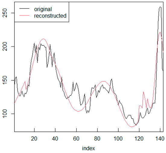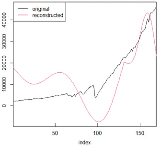 The results for the original Kondratieff data are proposed in the following graphs Figure 1, Figure 2, Figure 3, Figure 4, Figure 5, Figure 6, Figure 7, Figure 8, Figure 9, Figure 10, Figure 11 and Figure 12. To simplify a correct identification, the samples are labeled with the same capital letter proposed in Section 3.