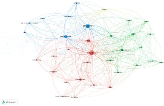 A further search was conducted using the keywords with the strongest links: COVID-19 (total link strength, 269; occurrences, 157; links, 31), efficiency (total link strength, 225; occurrences 102; links 30), performance (total link strength, 158; occurrences, 63; links, 27), and impact (total link strength, 162; occurrences, 60; 29 links). The process yielded 74 articles. A preliminary review of selected papers showed a concentration on macroeconomics and financial institutions. The search was focused on the Web of Science category ‘Business Finance’.