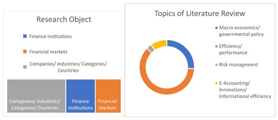 The results of the literature search were systemized by research object, topic, main research results, data employed, and research methods (see Supplementary Table S1). Figure 3 shows the main topics in the articles analyzed, with an emphasis on the investigation of efficiency or performance or the value of financial and non-financial institutions. The studies used various research methods, including descriptive statistical, regression, and ratio analysis, modeling, and survey questionnaires, and employed different sets of data from listed companies across industries and in different categories, banks, and stock exchanges.
