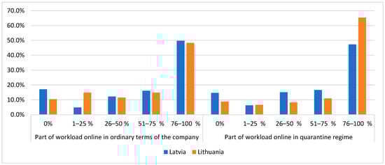 There were statistically significant (χ2 = 13.21, p = 0.01) differences in these options between countries. In Lithuania, only 10.4% of accountants were unable to work online under normal conditions and in Latvia, this number was 17.1%. Around half of the accounting specialists in both countries could perform more than 75% of their work remotely. There were also statistically significant differences in the distribution of the share of online work during the quarantine between the countries (χ2 = 14.42, p = 0.006): in Lithuania, 65.4% of respondents were able to work online for more than 75% of their working time, compared to only 47.3% in Latvia. In Latvia, the number decreased by 2.4 percentage points compared to the business-as-usual options. The number of people unable to work online in the quarantine regime in Latvia and Lithuania decreased by 2.5 and 1.6 percentage points, respectively (see Figure 4).