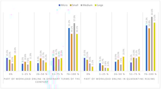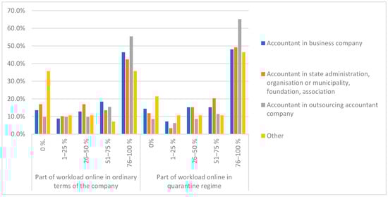 However, there was no statistically significant relationship between an employee’s current work position and the distribution of the online share of work under normal conditions (χ2 = 23.91, p = 0.092) and during quarantine (χ2 = 20.89, p = 0.183) and between the distribution of the online share of work in enterprises of different sizes and the distribution of the online share of work under normal conditions (χ2 = 7.78, p = 0.802) and during quarantine (χ2 = 14.57, p = 0.266). We concluded that the country environment had an impact on the online work opportunities for accounting specialists both in ordinary and quarantine conditions, whereas enterprise size and current work position did not.