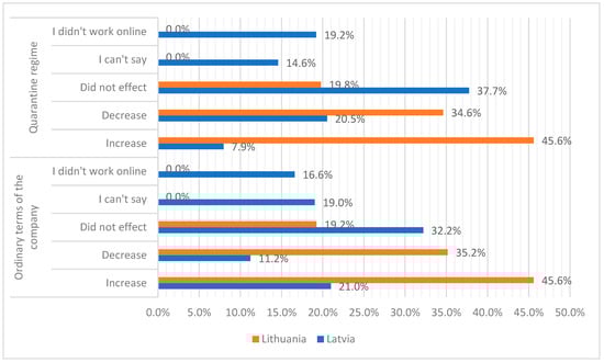Statistically significant (χ2 = 113.57, p = 0.000) differences in attitudes towards changes in office and online efficiency were found for the countries surveyed: 45.6% of Lithuanian and 21% of Latvian respondents indicated an increase in efficiency, while 35.2% of Lithuanian and 11.2% of Latvian respondents indicated a decrease in efficiency under normal working conditions. Under quarantine conditions, the attitudes of the countries’ accounting specialists towards changes in efficiency also differed significantly (χ2 = 117.83, p = 0.000): 45.6% of Lithuanian and only 7.9% of Latvian respondents identified an increase in efficiency, while 34.6% of Lithuanian respondents and 20.5% of Latvian respondents identified a decrease in efficiency (see Figure 7). A significantly higher proportion of Latvian respondents believed that working online had not affected their perceived effectiveness. Lithuanian accounting specialists did not perceive quarantine to have had any impact on their online performance, while Latvian respondents indicated a clear decrease in online performance under quarantine conditions compared to the company’s normal working conditions.