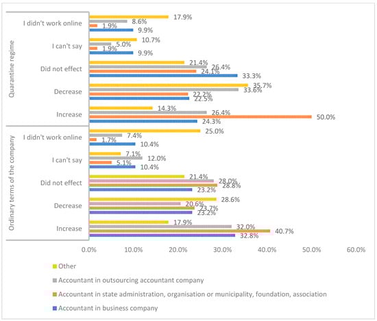 The analysis results regarding the possibility of working online in the ordinary and quarantine regimes show that 86% of respondents were able to work online under ordinary, non-crisis conditions; 49.1% could do so for more than 75% of their working time, and only 9.6% for up to a quarter of their working time. The possibility of remote working for accountants for more than 75% of their working time increased during the quarantine period by almost 7%. There were 2.1-percentage-point fewer respondents who reported that they were unable to work remotely even during the quarantine period, but the overall proportion of online work increased during the quarantine period, with 55.8% of respondents able to do so for more than 75% of their work time, and only 6.5% for up to a quarter of their time (see Table S2). The Wilcoxon signed-rank test showed statistically significant differences (Z = −2.74, p = 0.006) between the proportion of online work under normal and quarantine conditions; that is, there was an increase in the proportion of online work in the quarantine period compared to normal conditions.