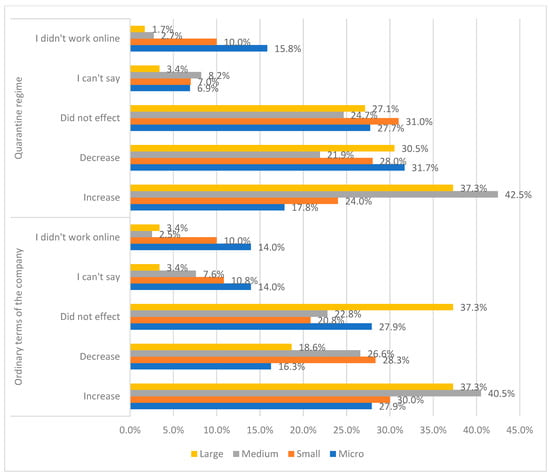 There was a statistically significant difference across enterprise categories in attitudes towards changes in efficiency observed under normal and quarantine conditions (Chi square test results respectively: χ2 = 27.34, p = 0.007 and χ2 = 27.20, p = 0.007). Under normal working conditions, a relatively higher proportion of employees in large and medium-sized enterprises indicated that efficiency had increased when working online, while the proportion of respondents in small and micro-enterprises who felt this way was significantly lower, at 27.9% and 30%, respectively. In large-sized enterprises, the highest proportion of accounting specialists reported that working online had no impact on their efficiency. While attitudes towards changes in efficiency as a result of online working remained similar under quarantine, there was a decrease in the proportion of respondents in micro-enterprises who thought that online working had a positive impact on their performance (see Figure 9).
