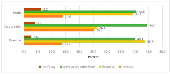 A total of 43.7% of the respondents indicated a decrease in the revenue of their companies, but much less—only 26.4%—a decrease in the cost of sales. This disproportionate variation can be explained by the relatively high share of service companies. A total of 13.7% of the respondents indicated that their company’s revenue level increased during the quarantine period, but 25.3% of the companies indicated an increase in the cost of sales. However, for a relatively large proportion of respondents (over 40%) revenue, cost of sales, and profit all remained stable (see Figure 10).