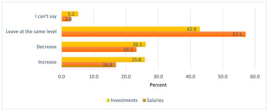 The level of investments differed significantly (χ2 = 74.27, p = 0.000) by country: in Latvia, the level of investments was again stable (54.1%), with an indication of respondents of a small increase (9.8%), while in Lithuania, there were significant changes, including an increase in the level of investments in 44% of cases (see Table S21). A statistically significant (χ2 = 25.85, p = 0.002) distribution of the level of investments was also found in the different sectors: companies in the trade sector show the highest proportion of decreases in the level of investments and the lowest proportion of increases, while the services sector shows the highest increase (36.6%) and the lowest proportion of decreases (see Table S22). No statistically significant differences in the change of the level of investment were found in various enterprise-size groups (χ2 = 11.50, p = 0.243).