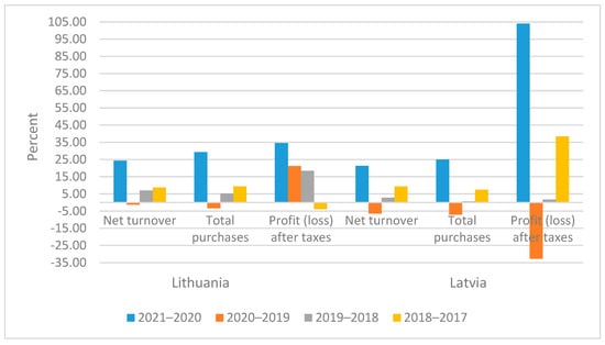 The analysis of the statistical data shows that, generally, all the main performance indicators analyzed dropped during the first phases of the crisis period (2020); however, clear differences between the countries were evident, even if net turnover and total purchases fluctuated from −1.24% to −6.4% and from −3.3% to −7%, respectively, in both countries. In Lithuania, profits after taxes increased by 21% compared with the previous year, and in Latvia, these decreased by almost 33%. However, overall, average fluctuations in the main performance indicators from 2017–2021 reached almost 13% in Lithuania and less than 14% in Latvia.