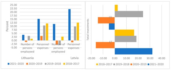 During the period analyzed, the biggest noticeable difference was the change in total investments—in Lithuania these increased, on average, by almost 13% and in Latvia by almost 2%. However, in Lithuania, the number of employees increased, on average, by almost 2% and personnel expenses by 10%; in Latvia, the number of employees increased by 2% and personnel expenses by 11%. According to the statistical data, both countries showed signs of recovery and stability.