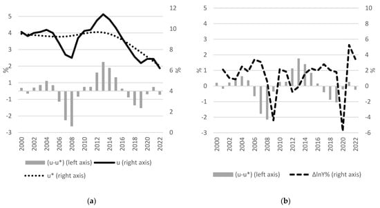 For example, in 2009 and 2020, when the negative growth rate was above 4%, the unemployment gap (u − u*) was still slightly negative (the economy was at full employment) since, for several years prior, the economy was constantly expanding, and the actual unemployment rate (u) was low. In contrast, the negative growth rate in 2012 and 2013 was below 1%. Still, the unemployment gap was significantly positive (actual unemployment was above its equilibrium level, i.e., cyclical unemployment) since the economic downturn happened just after the short and not robust recovery period. Considering periods of growth, during 2002–2005, i.e., during the recovery period, there was still a positive unemployment gap which turned negative during 2006–2007 at the later growth stage. In 2008, i.e., over the last year before the crisis hit, the unemployment gap remained significantly negative despite the growth rate being already below 1%. The same is true considering the economic boom period of 2014–2019. Over the first three years of this period, i.e., 2014–2016, when the economy started to recover from the last crisis, the unemployment gap was positive (the economy was not at its full potential and full employment) but steadily decreasing. During 2017–2019, after a longer and more robust period of growth, the unemployment gap turned negative and increased each year. Thus, we see that the size of the gap is a good indicator of whether there is a beginning (positive gap) or an end (negative gap) to the economic growth period. The same is true during an economic downturn, i.e., at its beginning the gap is negative and becomes positive when the crisis becomes long-lasting and severe.