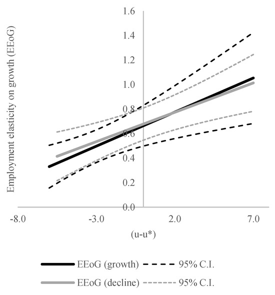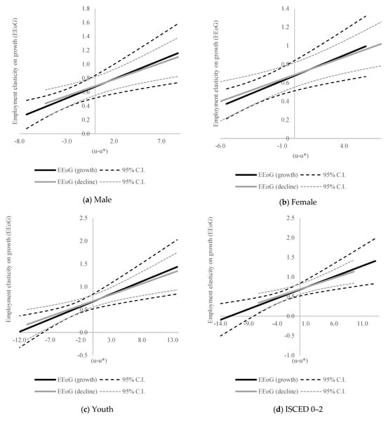 Our results strongly suggest that there is no statistically significant difference between elasticities across economic growth and decline periods, i.e., coefficient on the interaction term is insignificant at a 10% level. This conclusion is valid not just in cases when there is no unemployment gap, i.e., , but also for any value of a positive or negative gap since the effect of coefficient on interaction term is also insignificant at a 10% level. This is also evident from Figure 2, since both solid lines (black for the growth period and grey for the decline period) are very close, and their 95% confidence intervals (dashed lines) overlap. We find very similar results for all types of employment. The coefficients of elasticity differ from 0.54 for highly educated people to 1.04 for youth employment, suggesting that youth employment is the most sensitive to output change, followed by the employment of people with the lowest level of education (0.73). The elasticity of female employment (0.63) is slightly smaller than that of males (0.70). Still, they do not statistically significantly differ from the elasticity of total employment (0.66), considering the standard errors of the estimated coefficients.