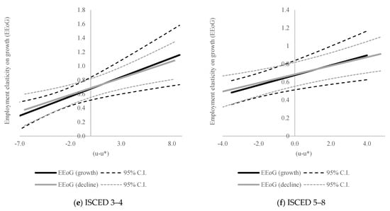 We find very similar results for other types of employment (see Table A2, Table A3, Table A4, Table A5, Table A6 and Table A7 in the Appendix B and Figure 3). The only exceptions are youth and ISCED 0–2 employment, which, according to our estimations, react to GDP change similarly, irrespective of the size of the unemployment gap.