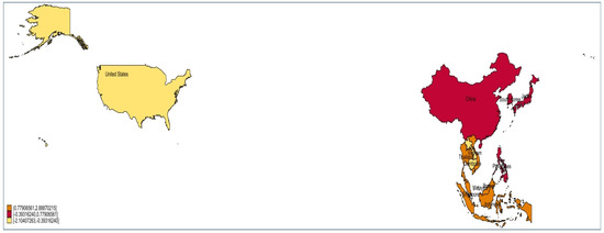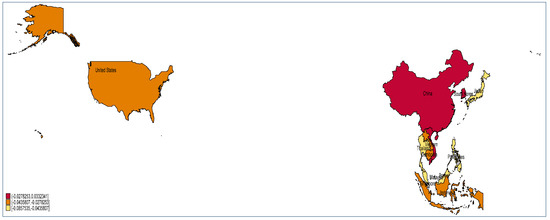 In contrast, Indonesia, Malaysia, the Philippines, Singapore, and Thailand, countries with close trade relations and geographical proximity, are classified in the group of countries with output gap rates in the middle group (−0.044 to −0.028 billion USD) and lowest group (−0.086 to −0.044 billion USD). The figures show the spillover effect of US monetary authority policy on the output gap of countries in the region (Georgiadis 2016; Ntshangase et al. 2023; Miranda-Agrippino and Rey 2020).