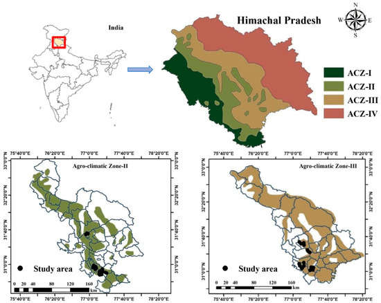 The study was conducted in Himachal Pradesh, India, situated in the foothills of the northwestern Himalayas. Himachal Pradesh is separated into four distinct agroclimatic zones, each characterised by varying elevations that span from below 650 to over 2200 metres above mean sea level (amsl). The study selected farm households from two distinct agroclimatic zones in the state: mid-hills subhumid, Zone-II, and high hills temperate wet, Zone-III. The decision was made based on the maximum area under the vegetable crops, according to JICA (2021). As a result, the research region was divided into two distinct strata, as shown in Figure 1.