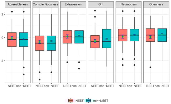Box plot of the distribution of non-cognitive skills in NEET and non-NEET youth groups. Note: the green points inside the boxes indicate the means for the groups, error bars refer to 0.95% confidence intervals, black dots visualize outliers.