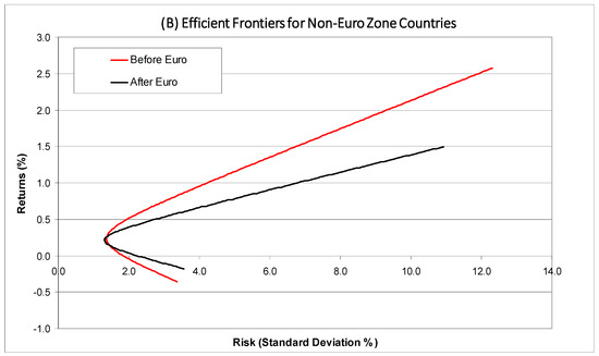(A) Efficient Frontiers for Euro Zone Countries; (B) Efficient Frontiers for Non-Euro Zone Countries.