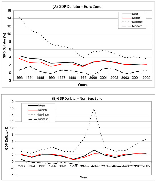 (A) GDP Deflator—Euro Zone; (B) GDP Deflator—Non-Euro Zone.