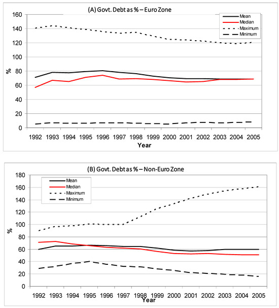Public Debt and Budget Balance: The Maastricht Treaty states that budget deficits should not exceed 3 percent of GDP and government debt should not exceed 60 percent of GDP. As Figure 5 and Figure 6 indicate, there have been violations of these provisions. Several countries violated the public debt provision. The number of countries in the eurozone that have failed to comply with the government debt provision is at least eight since 1994. The euro area’s average government gross financial liabilities as a percent of GDP exceeds 68 percent for each of the years under study. Luxembourg has the lowest figure (8 percent or less) for the years. Excluding Luxembourg increases the average figure for the eurozone to above 74 percent for the study period. Belgium, Italy, and Greece report higher figures, exceeding 100 percent for several years. Comparatively, the mean government debt is close to 60 percent for the non-euro countries in the sample (see Figure 5A,B).