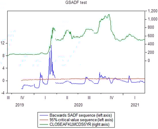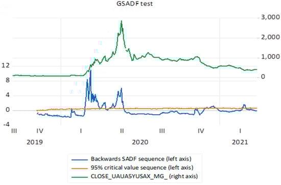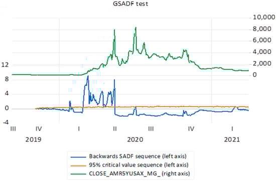 Finally, it should also be pointed out that we chose to start as early as September 2019 in order to provide the () procedure with sufficient observations. As indicated by the heuristic rule in Equation (4), with 367 observations for each series, a trimming factor of 0.103959 is recommended to ensure that the initial estimation is feasible, so that the GSADF and the SADF test statistics may be obtained. For the implementation of the test, we followed the authors’ recommended suggestion of obtaining the critical values through Monte Carlo simulation. An add-on for the right-tailed unit root test is available for Eviews. The double-recursive nature of the GSADF test statistic and the need to iterate 1000 times to obtain critical values for each possible series mad the procedure time-consuming (about 6 h of computational time for each series, using an i-7 processor, with 16 GB of RAM and 4.7 GhZ).