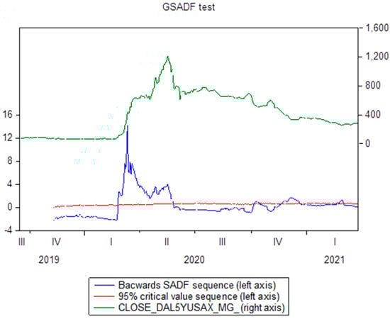 Table 2, Table 3 and Table 4 report the results of the GSADF test for the six aviation companies. Table 2 refers to the European airlines (the Air France–KLM group and the Deutsche Lufthansa AG group). Table 3 reports results for the world’s biggest LCC (Southwest Airlines) and for the world’s biggest airline in terms of generated revenue: Delta Airlines (). Both are USA-based. Finally, Table 4 reports results for the GSADF test for the second and third biggest airlines in the world in terms of generated revenue: American and United Airlines, respectively ().
