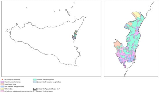 The fruit orchard to be estimated consisted of a specialized plant of avocado (cv. Hass), extended 1.2 hectares, with the same age (12 years). The density was 208 plants/ha (6 m by 8 m). It was cultivated with organic farming techniques and is located in Sicily, in the territory of “Piana di Mascali”, an alluvial plain located in the eastern part of the island, between the Ionian coast and the slopes of Volcano Etna. The area in which the fruit orchard is located is included within the agricultural region n. 7, called “Hills of Acireale”, at a distance of approximately 5 km from the local wholesale market for agricultural products. In the past, citrus groves (mainly lemon trees) were largely predominant in this area compared to other fruit crops (drupaceous, such as peach and cherry). In the following years, the unfavorable market dynamics of lemon production together have led to an increase in other fruit orchards. More recently, growing areas of avocado and pomegranate are increasing. Figure 1 shows the area of cultivation and the complex of crops, derived using Corine Land Cover (CLC 2018)
